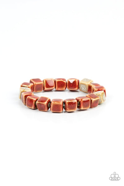Featuring distressed red and brown glazed finishes, a rustic collection of ceramic cube beads are threaded along stretchy bands around the wrist for a colorful flair.