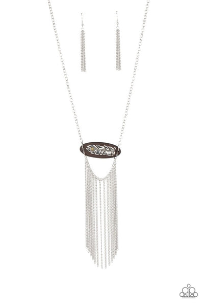 A fringe of silver chains swings from the bottom of a wooden frame adorned with a shimmery silver feather charm. Dotted with an earthy Military Olive stone, the whimsical pendant attaches to a lengthened silver chain for a free-spirited finish. Features an adjustable clasp closure.