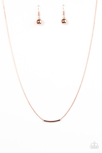 A bowing shiny copper rod slides along a rounded copper snake-chain, creating a bold minimalistic look below the collar. Features an adjustable clasp closure.