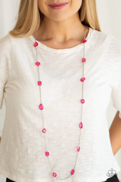 Featuring sleek silver fittings, an array of glassy pink gemstones trickle along a shimmery silver chain for a glamorous look. Features an adjustable clasp closure.