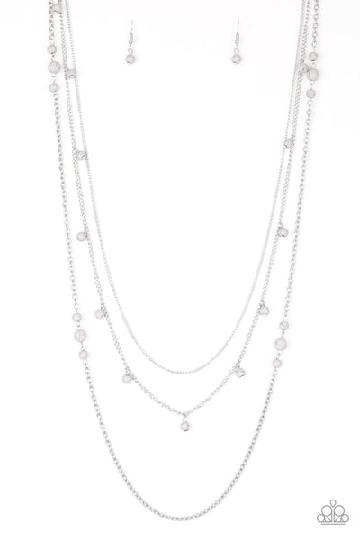 Infused with a plain silver chain, mismatched gray stone beads sporadically trickle along shimmery silver chains, creating earthy layers down the chest. Features an adjustable clasp closure.