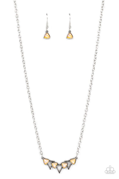 A staggered row of iridescent yellow triangular gems stack across front of a row of textured silver triangular frames, resulting in a stellar sparkle below the collar. Features an adjustable clasp closure.