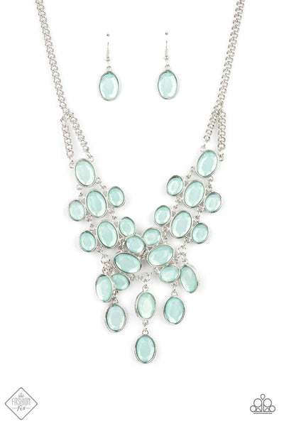 A dewy array of oval cut Blue Tint gems, pressed into silver frames, interconnect into a bubbly bib design. The display rests just below the collar for an exquisitely serene gleam. Features an adjustable clasp closure.