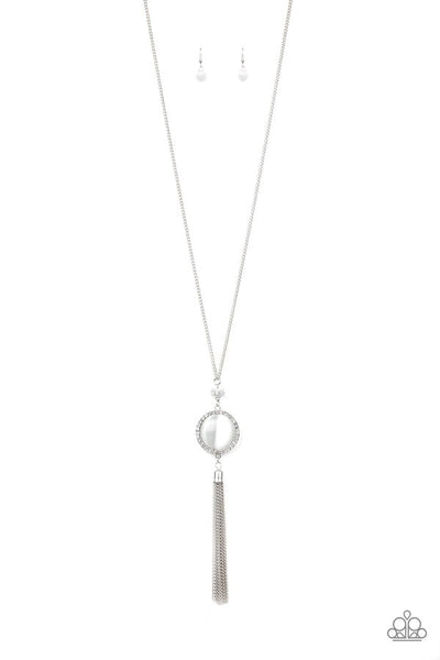 Encased in a frame of dazzling white rhinestones, a glowing white cat's eye stone pendant swings from the bottom of a sparkling bead. A classic silver tassel swings from the bottom of the colorful pendant for a refined finish. Features an adjustable clasp closure.