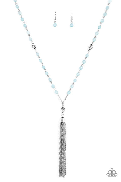 Blue opaque crystal-like beads, shiny silver beads, and white rhinestone encrusted rings give way to a shimmery silver tassel for a whimsical look. Features an adjustable clasp closure.