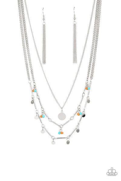A silver disc is suspended above two mismatched silver chains featuring a mismatched array of silver bars, silver discs, and pairs of blue and orange seed beads. The dainty display delicately layers below the collar, creating a colorful fringe. Features an adjustable clasp closure.