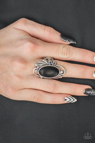 Chiseled into a smooth oval, an earthy black stone is pressed into the center of a glistening silver frame radiating with filigree detail for a seasonal look. Features a stretchy band for a flexible fit.
