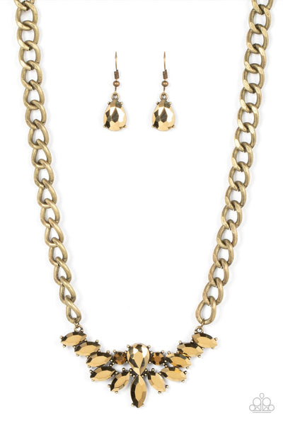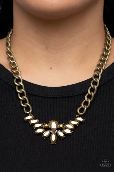 Glitzy marquise cut aurum rhinestones fan out from the bottom of an oversized teardrop aurum rhinestone, resulting in a gritty pendant at the bottom of a chunky brass chain for a sassy statement. Features an adjustable clasp closure.