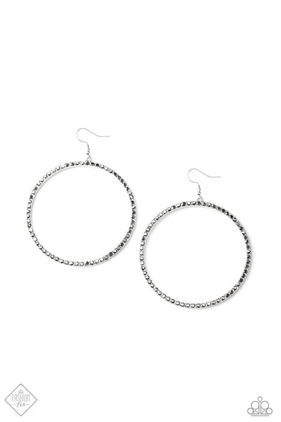 Encrusted in smoky hematite rhinestones, a dramatically oversized hoop swings from the ear for an exaggerated effect. Earring attaches to a standard fishhook fitting. Hoop measures approximately 2 1/4" in diameter.